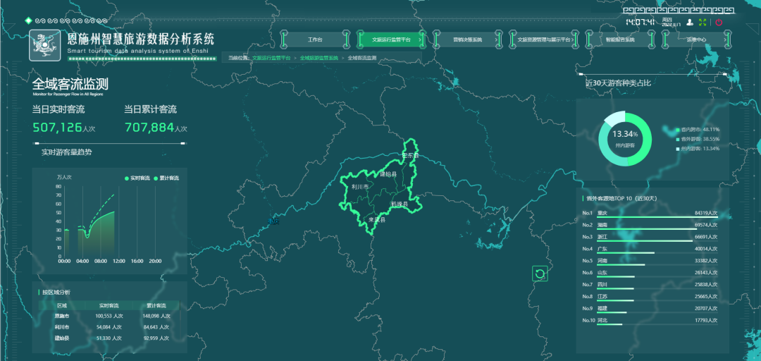 恩施州智慧旅游數(shù)據(jù)分析系統(tǒng)于2022年3月啟動(dòng)建設(shè),2022年9月上線試運(yùn)行,完成了文旅資源管理與展示平臺(tái)、旅運(yùn)行監(jiān)管平臺(tái)、營(yíng)銷決策系統(tǒng)、智能報(bào)告系統(tǒng)等4大板塊12子系統(tǒng)合計(jì)36個(gè)功能模塊的開發(fā)。系統(tǒng)共收集了恩施州6縣2市的景區(qū)、旅行社、酒店、博物館、圖書館、文化館、村村響、發(fā)射站等3000余條基礎(chǔ)數(shù)據(jù),完成13家A級(jí)景區(qū)客流、25家景區(qū)175路視頻(恩施州景區(qū)視頻指揮調(diào)度系統(tǒng))對(duì)接,也完成了OTA網(wǎng)評(píng)、交通擁堵、全域客流等第三方數(shù)據(jù)對(duì)接。