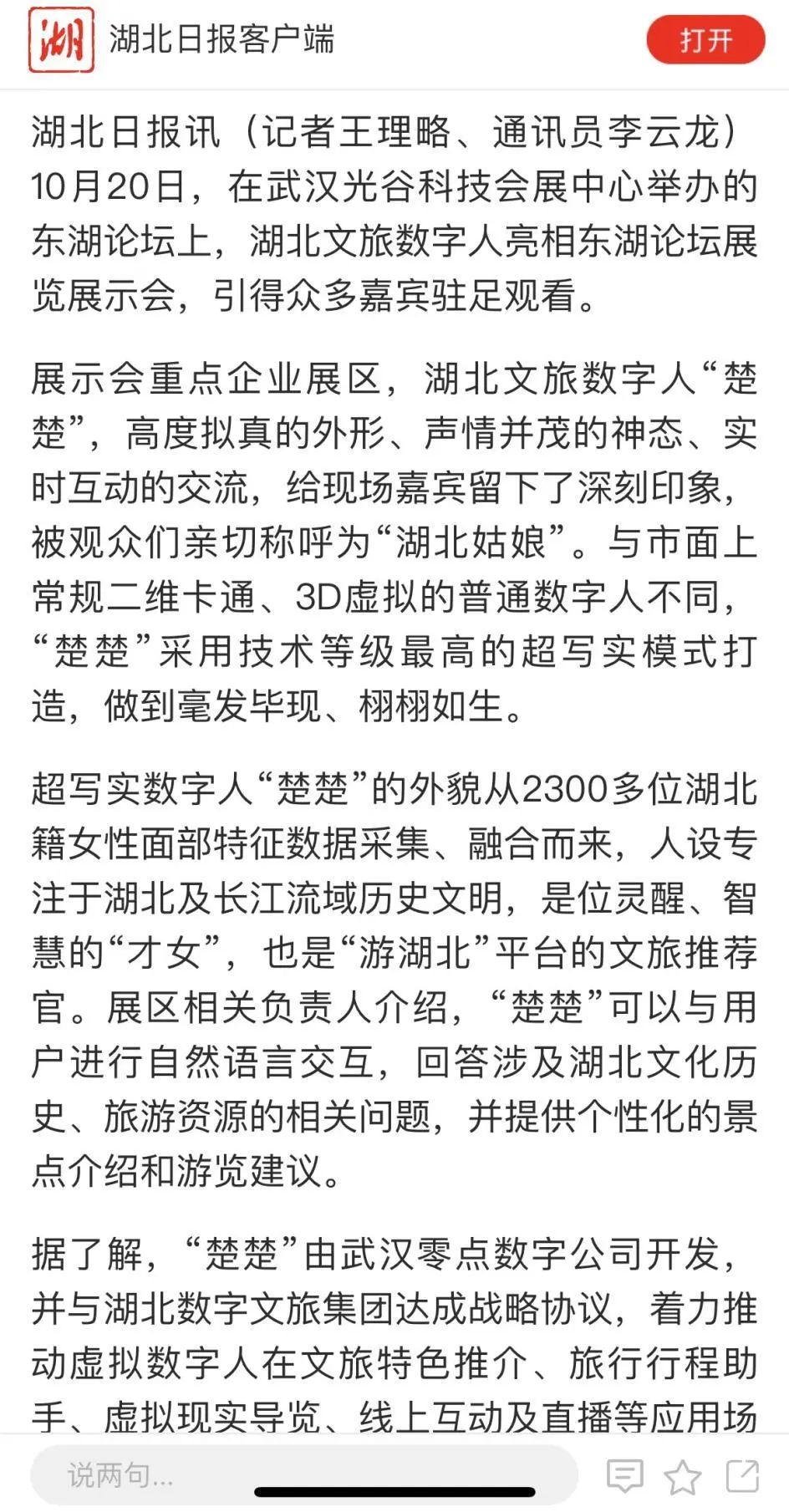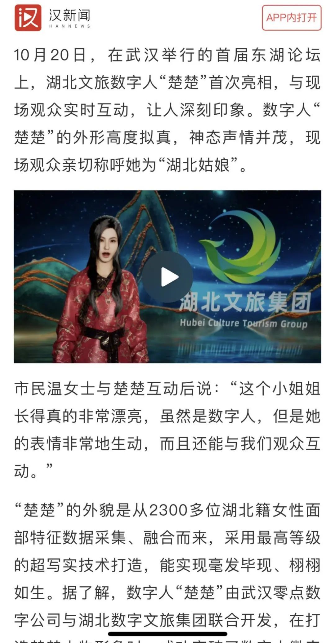 10月20日至22日,“東湖論壇”在武漢光谷國際會展中心隆重舉行,湖北文旅集團(tuán)受邀參加“2023東湖論壇·重點(diǎn)企業(yè)展區(qū)展示會”,湖北文旅集團(tuán)旗下湖北數(shù)字文旅集團(tuán)“楚楚”數(shù)字人首次亮相展會。