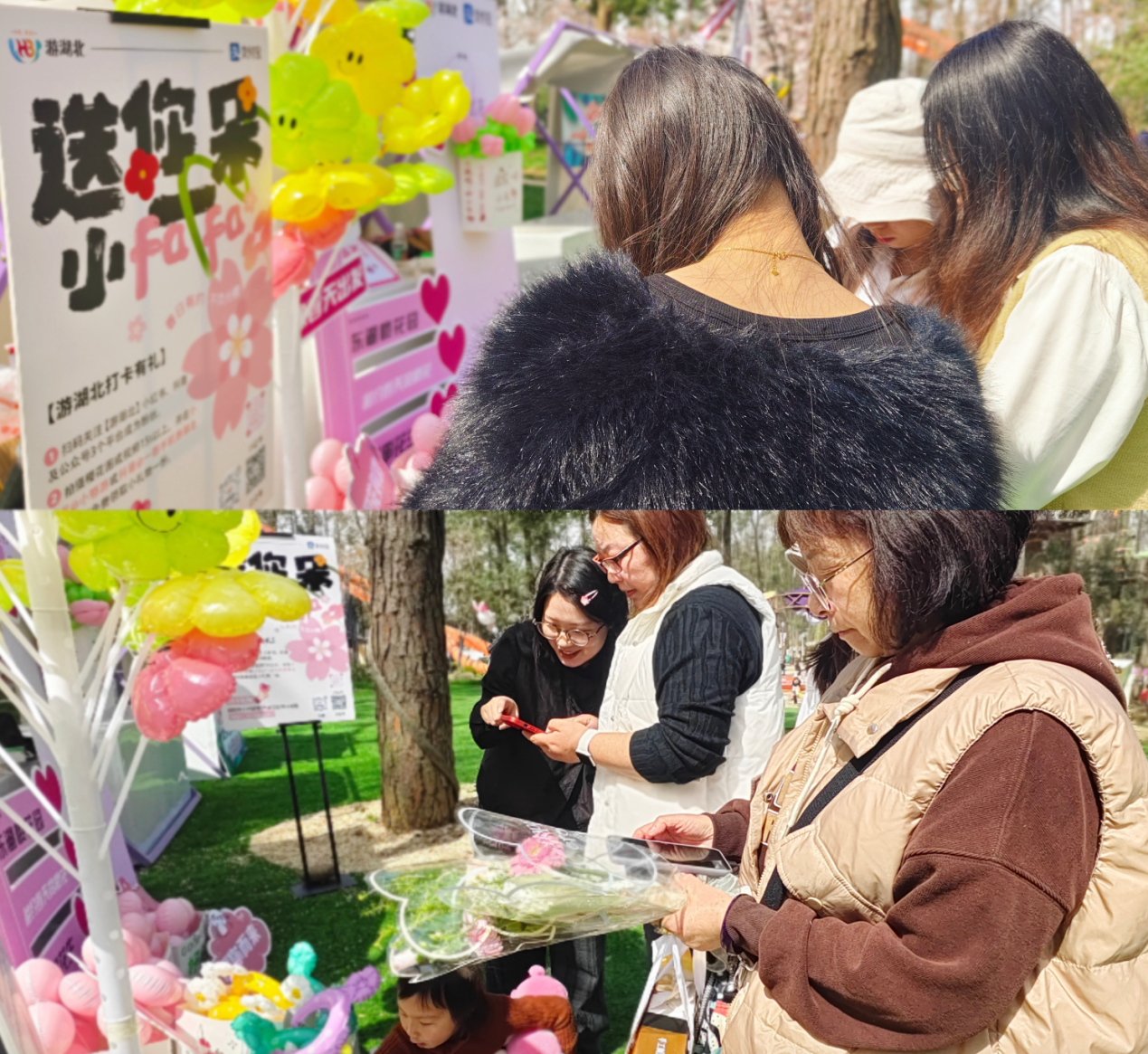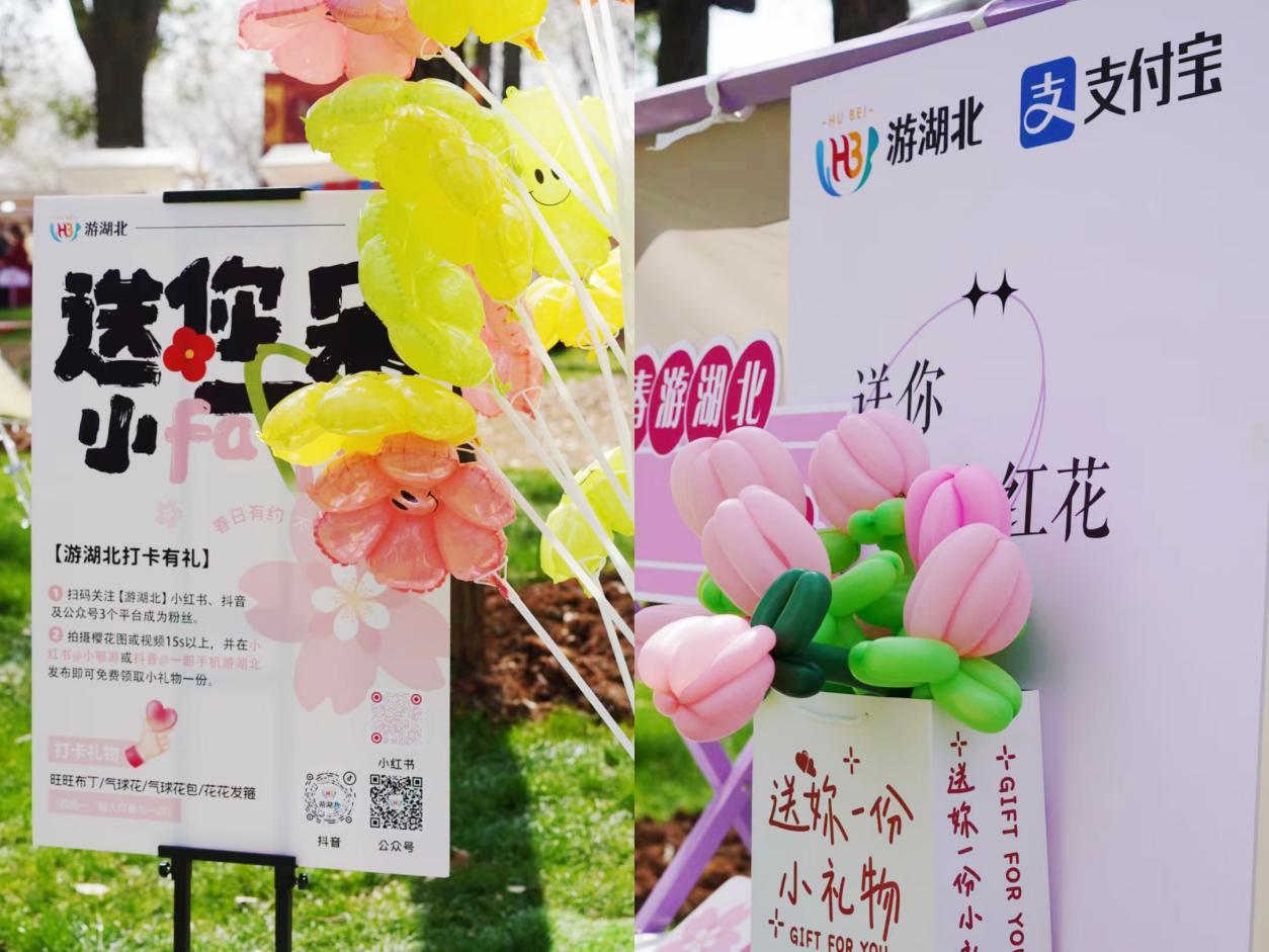 活動(dòng)現(xiàn)場(chǎng),游客們只需掃碼關(guān)注“游湖北”新媒體矩陣賬號(hào),并分享賞櫻圖片或視頻至社交平臺(tái),即可獲得旺旺布丁/氣球花/氣球花包/花花發(fā)箍等精美禮品。豐富多樣的禮品引來眾多賞花游客圍觀打卡,現(xiàn)場(chǎng)圈粉無數(shù)。