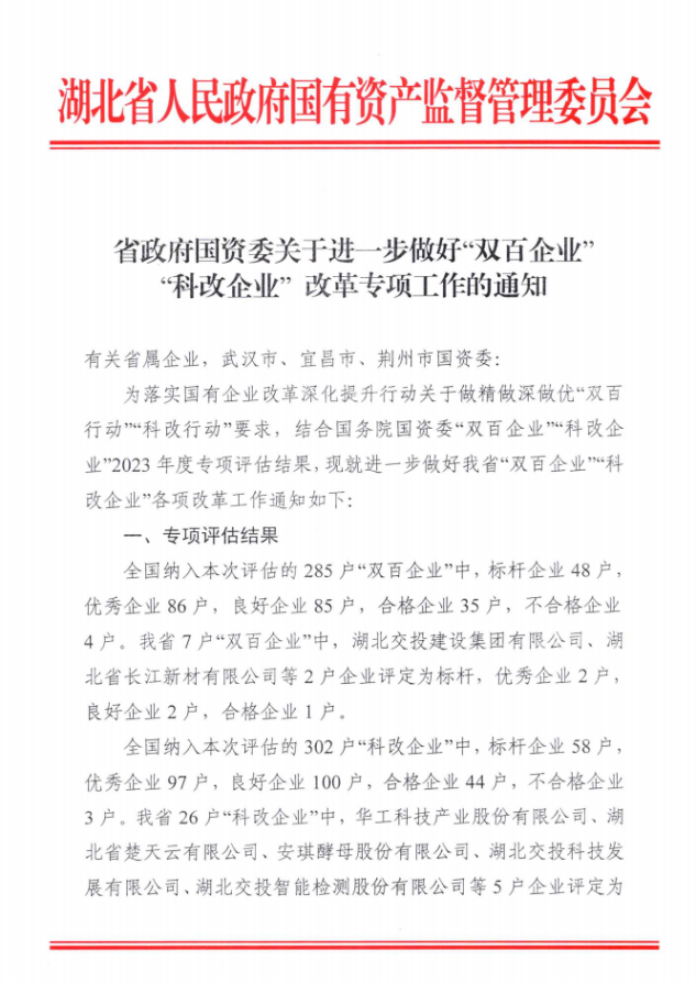 本次考核是國(guó)資委組織對(duì)地方所屬“科改”“雙百”企業(yè)年度改革創(chuàng)新情況開(kāi)展的專(zhuān)項(xiàng)考核,湖北省納入本次考核的科改企業(yè)26戶,優(yōu)秀企業(yè)8戶。