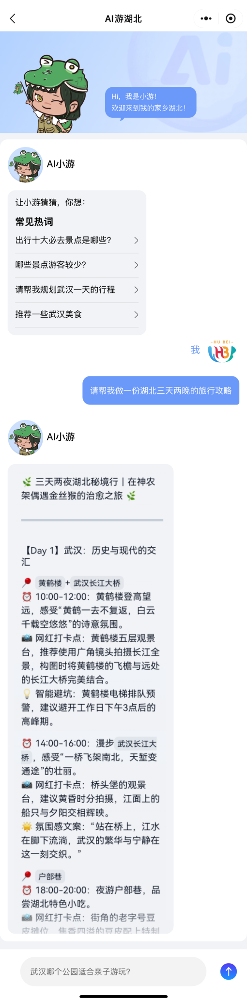 近日,數(shù)旅集團游湖北平臺正式上線“AI游湖北”板塊,無論是行程規(guī)劃、景點介紹,還是實時天氣查詢、景區(qū)客流預警,都能輕松實現(xiàn)。為游客提供更加全面、便捷、智能的旅游服務,進一步推動數(shù)旅集團在文旅領域的創(chuàng)新發(fā)展。