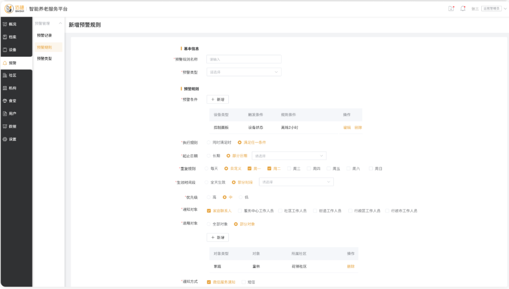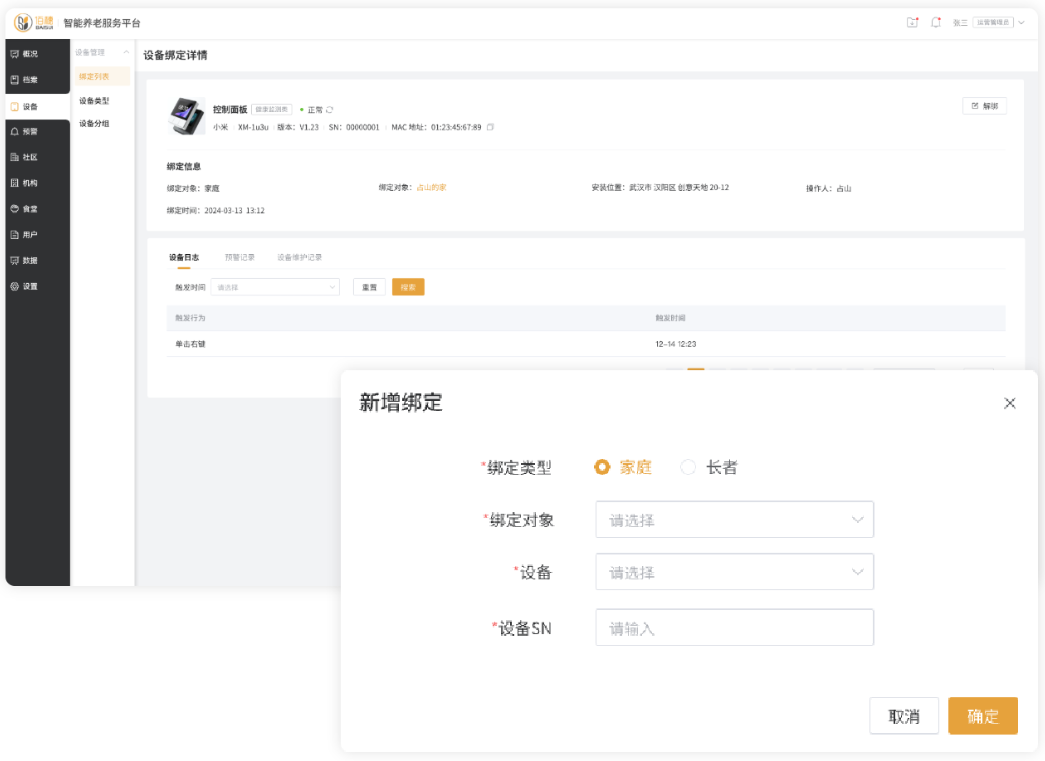 可實(shí)時(shí)采集設(shè)備連接狀態(tài)與運(yùn)行狀態(tài)數(shù)據(jù)。無(wú)論是設(shè)備的在線/離線情況,還是運(yùn)行中的各項(xiàng)參數(shù)指標(biāo),都能精準(zhǔn)掌握。以便及時(shí)發(fā)現(xiàn)設(shè)備異常,快速定位問(wèn)題,確保智能設(shè)備始終處于良好工作狀態(tài),為養(yǎng)老服務(wù)提供可靠支撐。