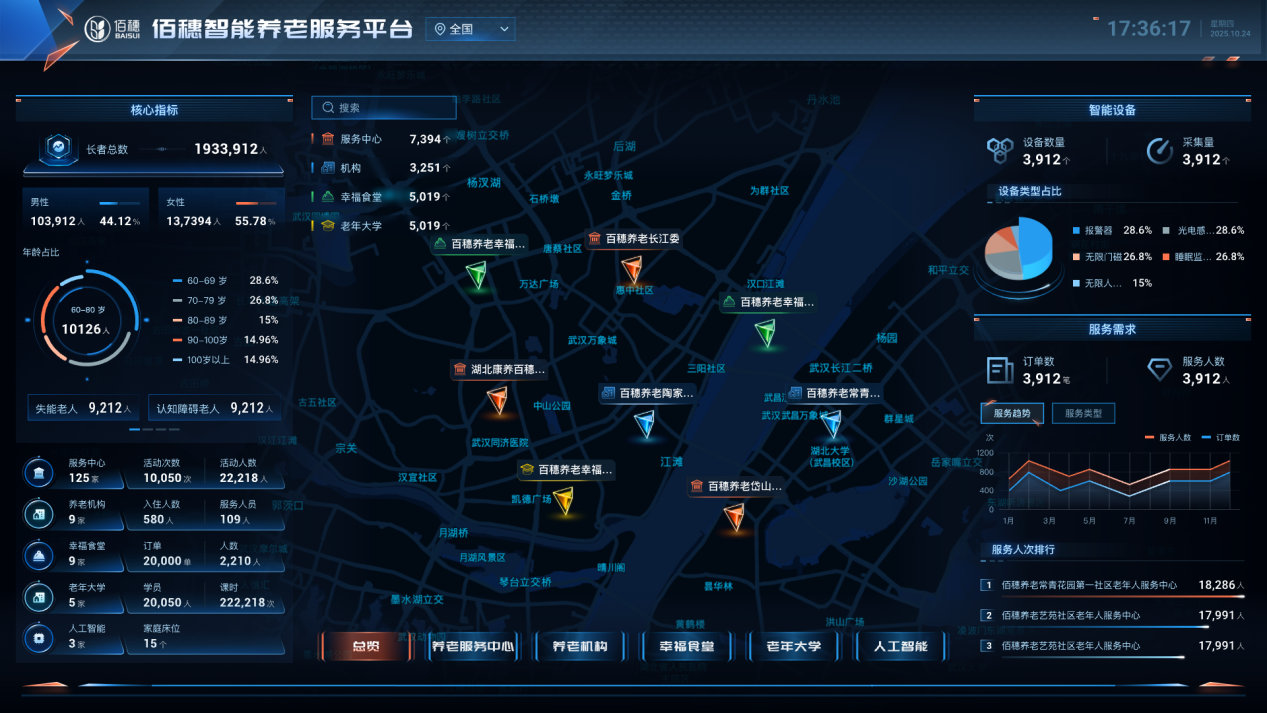 全面集成了長(zhǎng)者、智能設(shè)備、服務(wù)需求等各類(lèi)信息,不僅能展示長(zhǎng)者總數(shù)、性別年齡分布、失能及認(rèn)知障礙等特殊老人數(shù)量,還涵蓋服務(wù)中心、機(jī)構(gòu)等養(yǎng)老設(shè)施相關(guān)數(shù)據(jù)。通過(guò)地圖標(biāo)記、餅圖、折線圖等可視化方式,將復(fù)雜數(shù)據(jù)直觀呈現(xiàn),同時(shí)精準(zhǔn)統(tǒng)計(jì)設(shè)備數(shù)量、采集量、訂單數(shù)等,支持按時(shí)間篩選。