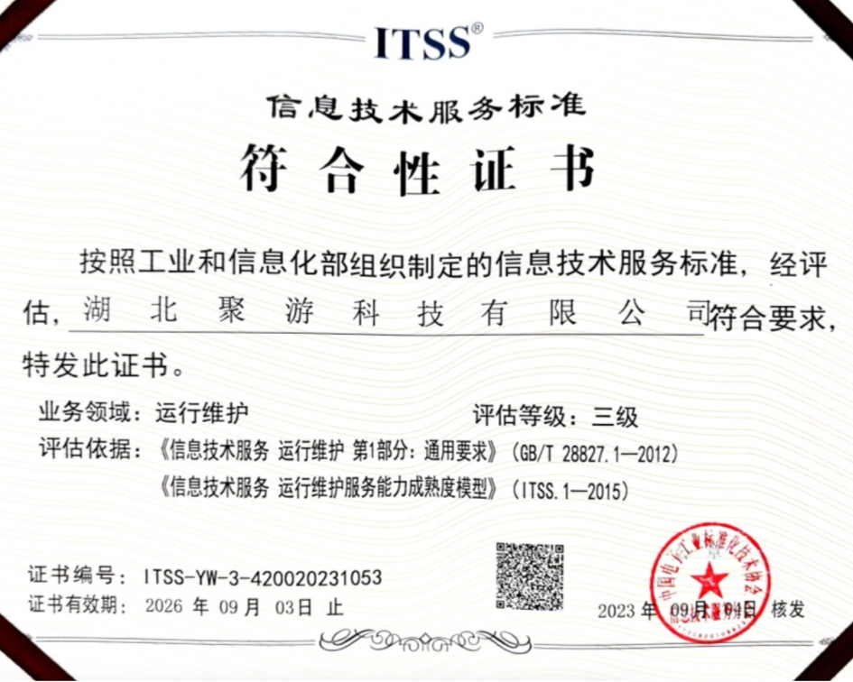 聚游科技獲ITSS信息技術(shù)服務(wù)運(yùn)行維護(hù)標(biāo)準(zhǔn)符合性三級證書