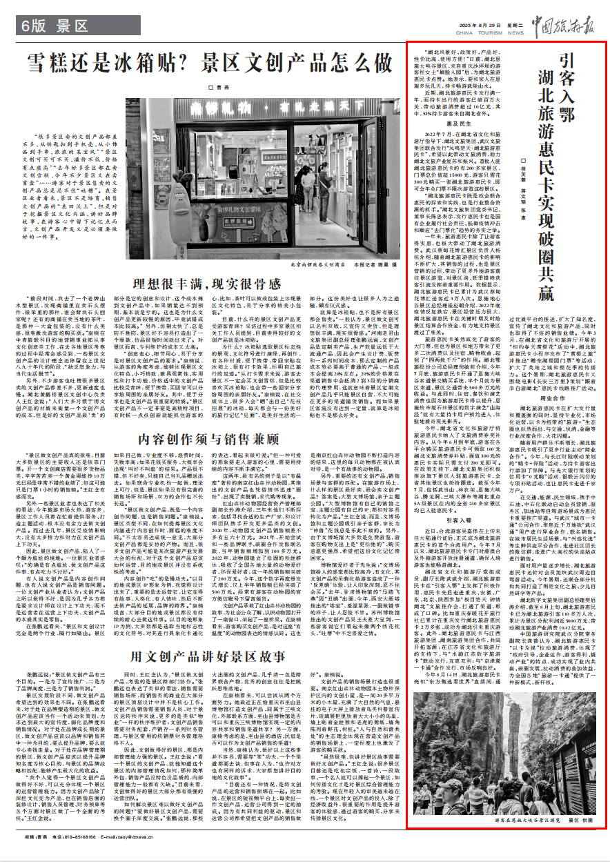 編者按:日前,《中國(guó)旅游報(bào)》以《引客入鄂 湖北旅游惠民卡實(shí)現(xiàn)破圈共贏》為題,聚焦湖北旅游惠民卡“引客入鄂”、撬動(dòng)產(chǎn)業(yè)以及創(chuàng)新運(yùn)營(yíng)的相關(guān)成效,現(xiàn)將相關(guān)內(nèi)容轉(zhuǎn)載如下。 □ 程芙蓉 蔣文韜 張惠 “湖北風(fēng)景好、政策好、產(chǎn)品好,性價(jià)比高,使用方便!”日前,湖北恩施大峽谷景區(qū),來(lái)自重慶沙坪壩的游客程女士“刷臉入園”后,為湖北旅游惠民卡點(diǎn)贊。她表示,要和家人在恩施多玩幾天,持卡暢游武陵山水。 近期,湖北旅游惠民卡發(fā)行滿一年,而持卡出行的游客已破百萬(wàn)大關(guān),帶動(dòng)旅游消費(fèi)超過10億元,其中,53%持卡游客來(lái)自湖北省外。 惠及民生 2022年7月,在湖北省文化和旅游廳指導(dǎo)下,湖北文旅集團(tuán)、武漢文旅集團(tuán)聯(lián)合發(fā)行“鳳鳴楚天·湖北旅游惠民卡”,希望以此帶動(dòng)文旅消費(fèi),助力湖北文旅產(chǎn)業(yè)復(fù)蘇和振興。首批入駐湖北旅游惠民卡的有200多家景區(qū),門票總價(jià)值超15000元,游客只需花300元購(gòu)買一張湖北旅游惠民卡,即可全年免門票不限次游覽這些景區(qū)。 “湖北旅游惠民卡既是政企聯(lián)合惠民的探索和實(shí)踐,也是行業(yè)整合資源的抓手。”湖北文旅集團(tuán)黨委書記、董事長(zhǎng)陳忠表示,發(fā)行惠民卡也是國(guó)有企業(yè)履行社會(huì)責(zé)任、抵御疫情沖擊和順應(yīng)“去門票化”趨勢(shì)的務(wù)實(shí)之舉。 一年來(lái),旅游惠民卡除了讓游客得實(shí)惠,也極大帶動(dòng)了湖北旅游消費(fèi)。武漢蔡甸花博匯景區(qū)負(fù)責(zé)人楊棟介紹,隨著湖北旅游惠民卡的影響不斷擴(kuò)大,其銷售的過程,也是景區(qū)營(yíng)銷的過程,帶動(dòng)了更多外地游客前往景區(qū)游覽,對(duì)景區(qū)淡、旺季錯(cuò)峰獲客引流發(fā)揮著重要作用。數(shù)據(jù)顯示,湖北旅游惠民卡已累計(jì)為武漢蔡甸花博匯送客近3萬(wàn)人次。恩施地心谷景區(qū)總經(jīng)理崔應(yīng)朝介紹,2022年底疫情反復(fù)跌宕,景區(qū)經(jīng)營(yíng)壓力很大,湖北旅游惠民卡在關(guān)鍵時(shí)期及時(shí)給景區(qū)結(jié)算合作資金,有力地支持景區(qū)渡過了難關(guān)。 旅游惠民卡雖然減免了游客的大門票,但也為景區(qū)和地方帶來(lái)了更多二次消費(fèi)以及住宿、購(gòu)物收益,起到了“四兩撥千斤”的作用。湖北鄂旅股份公司總經(jīng)理倪敏莉介紹,今年7月底,旅游惠民卡開通了恩施大峽谷索道景交購(gòu)買系統(tǒng),半個(gè)月就為景區(qū)索道、景區(qū)交通帶來(lái)500多萬(wàn)元的收益。與此同時(shí),住宿、餐飲和演藝消費(fèi)也因?yàn)槁糜位菝窨ǖ靡蕴嵘魇┧蟛紙菏志皡^(qū)的數(shù)字演藝“山海涇”就有大量持卡用戶預(yù)約進(jìn)入,體驗(yàn)地質(zhì)奇觀光影秀。 今年,湖北省文化和旅游廳將旅游惠民卡納入了文旅消費(fèi)券獎(jiǎng)補(bǔ)內(nèi)容。從今年6月到年底,游客在各平臺(tái)購(gòu)買旅游惠民卡可領(lǐng)取100元湖北文旅消費(fèi)券補(bǔ)貼,面值300元的惠民卡實(shí)際只需支付200元即可。在政策支持下,湖北文旅集團(tuán)積極推動(dòng)旗下景區(qū)入駐旅游惠民卡,全省其他景區(qū)也紛紛跟進(jìn)。截至今年7月,包括武當(dāng)山、神農(nóng)架、恩施大峽谷、騰龍洞、三峽大瀑布等湖北重點(diǎn)5A級(jí)景區(qū)在內(nèi)的全省240多家景區(qū)均已入駐惠民卡。 引客入鄂 近日,臺(tái)灣游客吳嘉偉在上傳來(lái)往大陸通行證后,正式成為湖北旅游惠民卡的首個(gè)臺(tái)灣用戶。今年7月以來(lái),湖北旅游惠民卡專門對(duì)港澳臺(tái)及外籍游客開放注冊(cè)通道,確保入境游客也能暢游湖北。 湖北省文化和旅游廳黨組成員、副廳長(zhǎng)陳武斌介紹,湖北旅游惠民卡在“引客入鄂”上發(fā)揮了積極作用,惠民卡先后走進(jìn)重慶、安徽、廣東、北京、陜西參加“極目楚天 鐘情湖北”文旅推介會(huì),打通了渠道,形成了口碑。比如重慶春暖花開旅行社已累計(jì)在重慶發(fā)行湖北旅游惠民卡2萬(wàn)多張,成功為湖北引來(lái)重慶游客。此外,湖北旅游惠民卡與江西旅游集團(tuán)、湖南旅游集團(tuán)合作,共同開拓客源;在江蘇省文化和旅游廳的支持下,與“水韻江蘇數(shù)字旅游卡”聯(lián)動(dòng)發(fā)行,互惠互利;與“京津冀一卡通”合作發(fā)行,市場(chǎng)反響良好。 今年8月14日,湖北旅游惠民卡亮相“東方甄選看世界”直播間,通過優(yōu)質(zhì)平臺(tái)的推送,擴(kuò)大了知名度,宣傳了湖北文化和旅游產(chǎn)品,同時(shí)也取得了不俗的銷售業(yè)績(jī)。今年3月,在湖北省文化和旅游廳開展的“相約春天賞櫻花”活動(dòng)中,湖北旅游惠民卡小程序發(fā)布了“賞櫻之旅”并推出“贈(zèng)東湖櫻園門票”等活動(dòng),擴(kuò)大了英雄之城和櫻花季的傳播力。這個(gè)暑期,湖北旅游惠民卡又圍繞電影《長(zhǎng)安三萬(wàn)里》策劃“跟著李白游湖北”惠民卡線路推廣活動(dòng)。 跨業(yè)合作 湖北旅游惠民卡在擴(kuò)大發(fā)行量和覆蓋面的同時(shí),堅(jiān)持專業(yè)化、市場(chǎng)化運(yùn)營(yíng),以卡為紐帶的“旅游+”生態(tài)圈也躍然而出,與交通、快消、金融等行業(yè)深度合作,火