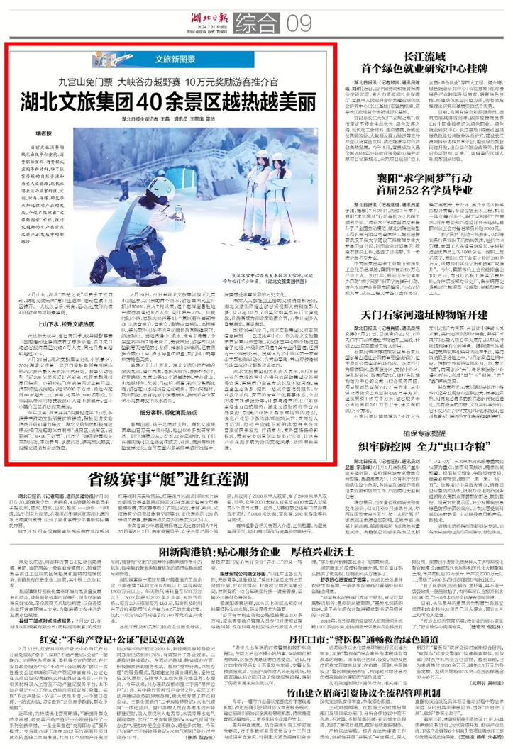 湖北文旅集團(tuán)40余景區(qū)越熱越美麗。7月中旬,湖北“荊楚之夏”消費(fèi)季正式啟動,湖北文旅集團(tuán)“夏日生活季”活動在旗下景區(qū)鋪開,一大批以音樂、美食、運(yùn)動、社交等為核心的新業(yè)態(tài)新場景涌現(xiàn);積極響應(yīng)相關(guān)部門發(fā)起的體育賽事“進(jìn)景區(qū)、進(jìn)街區(qū)、進(jìn)商圈”、“6·16三好節(jié)”、百萬學(xué)子游荊楚等相關(guān)主題活動,拿出百萬元專項(xiàng)補(bǔ)貼,推出了500多款研學(xué)產(chǎn)品,集團(tuán)首家室內(nèi)滑雪場,武漢冰雪中心整個場館包含了初級、中級和練習(xí)道3條專業(yè)滑雪道,還擁有一個地形公園。娛雪區(qū)為華中地區(qū)第一家雪山主題極限運(yùn)動區(qū),含雪山攀、雪山穿梭滑梯等冰雪沉浸式刺激游玩項(xiàng)目,發(fā)揮文旅消費(fèi)帶動效應(yīng)。