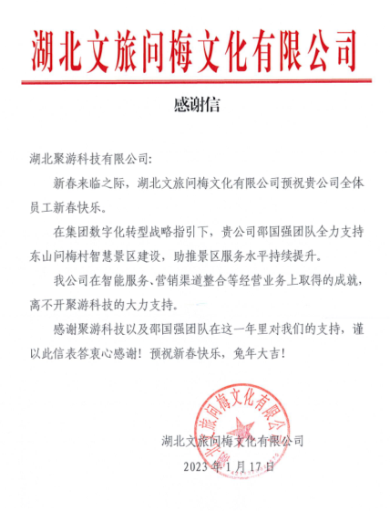 聚游科技收到湖北文旅問梅公司感謝信